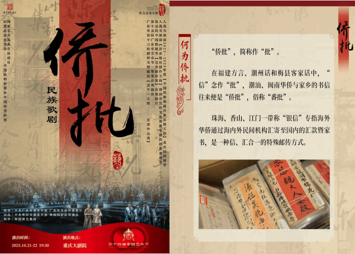 民族歌剧《侨批》以侨批文化为独特题材,围绕一封跨越重洋的“侨批”信件展开叙事,通过展现华工、侨批局主事及众多海外华侨华工的命运纠葛,深情讴歌了海外侨胞深厚的家国情怀与恪守承诺的诚信精神。该剧创作严谨,叙事结构融合中国传统戏曲手法,音乐创作巧妙结合西方歌剧元素与中国民族音乐,实现了民族歌剧戏剧性表达的创新突破,堪称中国民族歌剧发展历程中的重要探索与高峰之作。