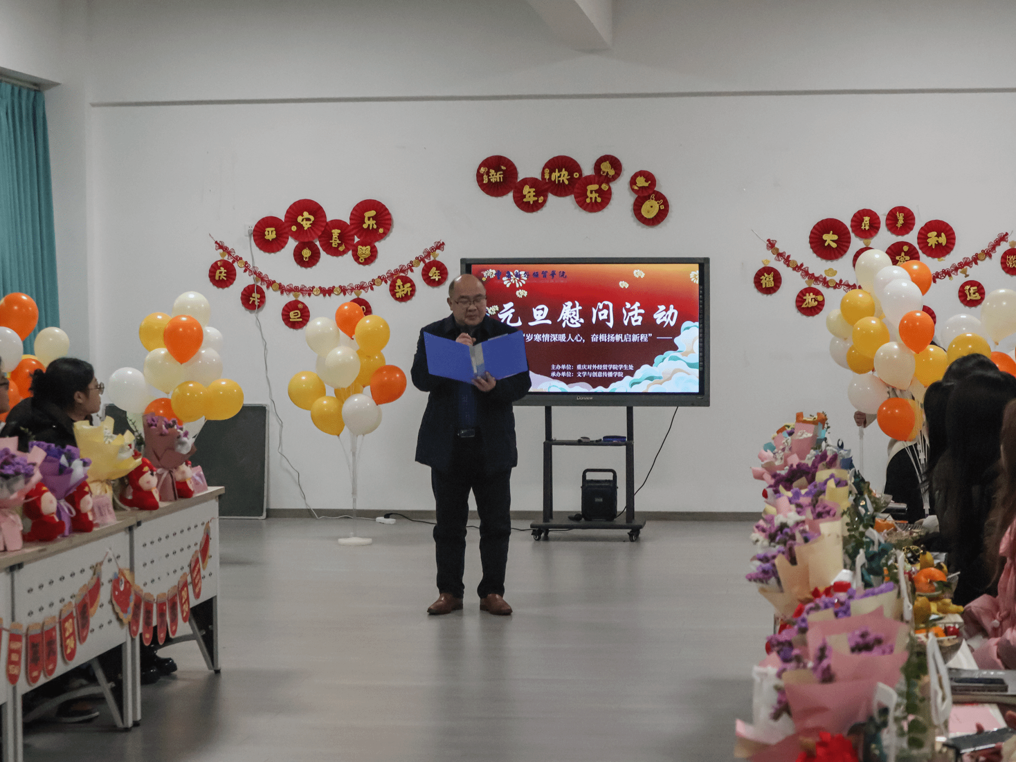 元春始风华,万象启新潮。为进一步构建和谐校园,传递美好与温暖,加强对广大同学的关心关爱,在元旦佳节即将到来之际,学生处携文学与创意传播学院于2023年12月21日在A校区6107举办了以“岁寒情深暖人心,奋楫扬帆启新程”为主题的元旦慰问活动。出席此次活动的有党委书记(督导专员)何大海、常务副校长王乃武、学生处处长伍祥伦,文学与创意传播学院常务副院长段庸生、副院长陈寿琴及学生处相关负责老师和各学院辅导员代表、学生代表。此次元旦慰问活动主要分为赏花灯、庆佳节、享美食三个环节。