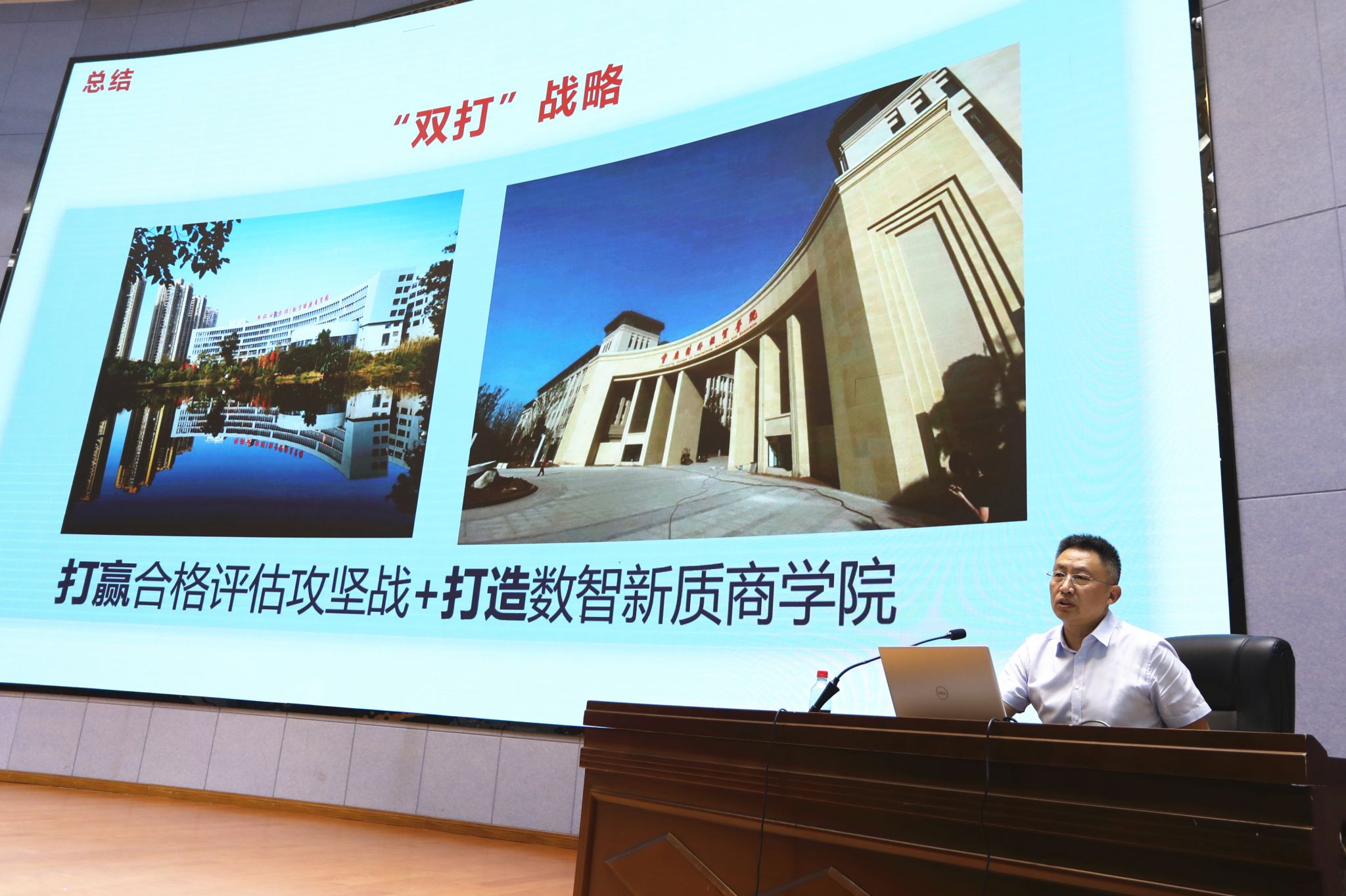 会上,李明海校长回顾了他在上半年春季学期开学干部大会、本科教学工作合格评估动员大会上提到的会议精神。他以“攻坚拼实力 发展靠定力”为主题,围绕高等教育大势观察、以新质人才培养引领学校高质量发展两部分内容,发表了秋季开学干部大会讲话。对于以新质人才培养引领学校高质量发展,他指出:一是办学定位再明确;二是办学特色再凝练;三是培养模式再创新;四是产学研创再发力;五是转型发展再提速。他总结学校下半年要做好“双打”战略:打赢合格评估攻坚战+打造数智新质商学院。