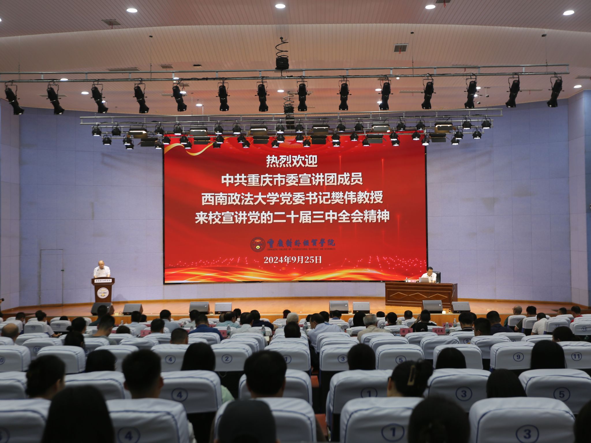 9月25日下午,中共重庆市委宣讲团成员、西南政法大学党委书记樊伟教授到校宣讲党的二十届三中全会精神。宣讲会在合川A校区9101学术报告厅举行,党委书记何大海主持会议,在家校领导、驻校理事、校长助理出席会议。