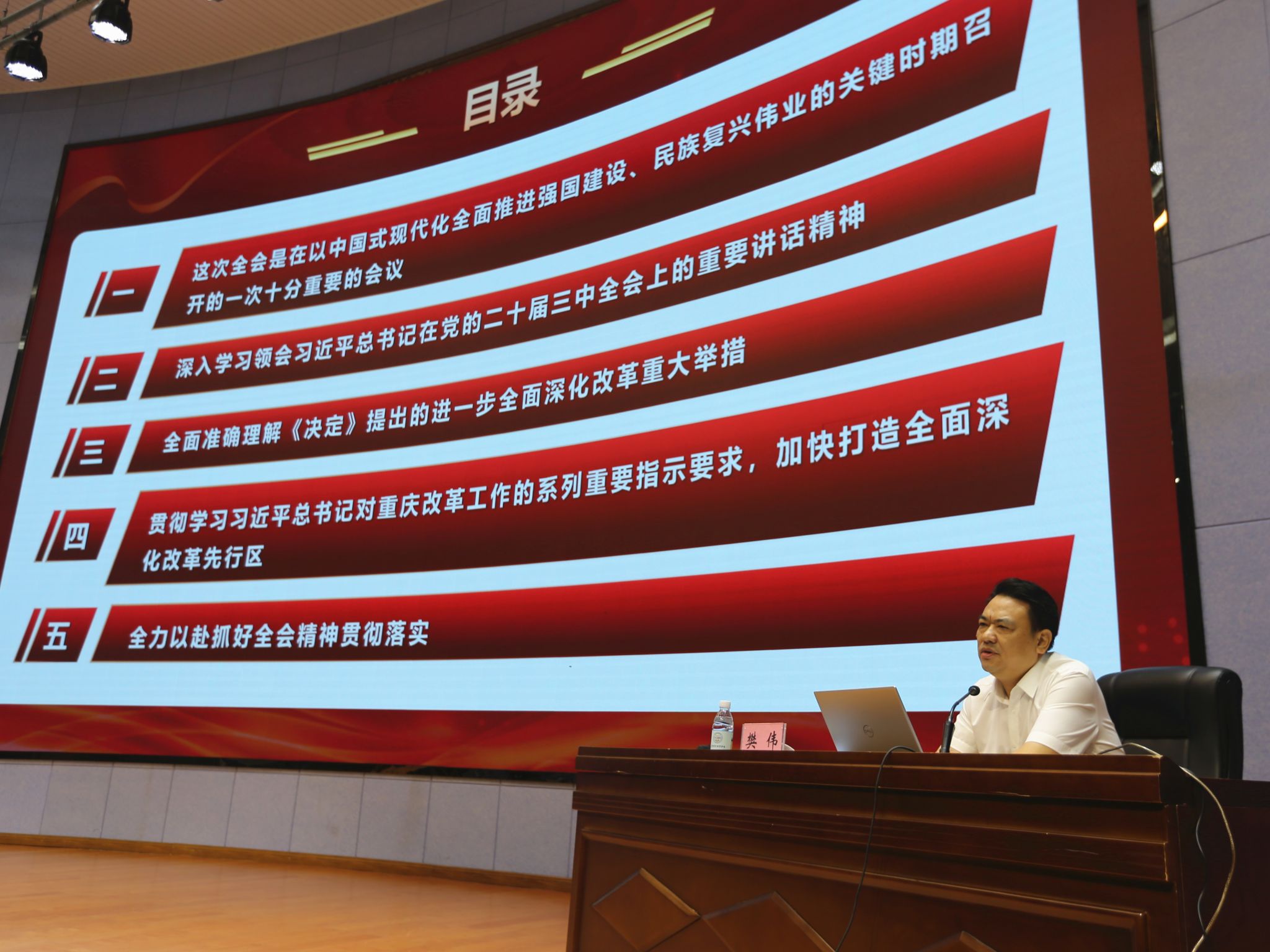 宣讲会紧密联系工作实际,从“这次全会是在以中国式现代化全面推进强国建设、民族复兴伟业的关键时期召开的一次十分重要的会议;深入学习领会习近平总书记在党的二十届三中全会上的重要讲话精神;全面准确理解《决定》提出的进一步全面深化改革重大举措;贯彻学习习近平总书记对重庆改革工作的系列重要指示要求,加快打造全面深化改革先行区;全力以赴抓好全会精神贯彻落实”五个方面对党的二十届三中全会精神进行了深入解读。