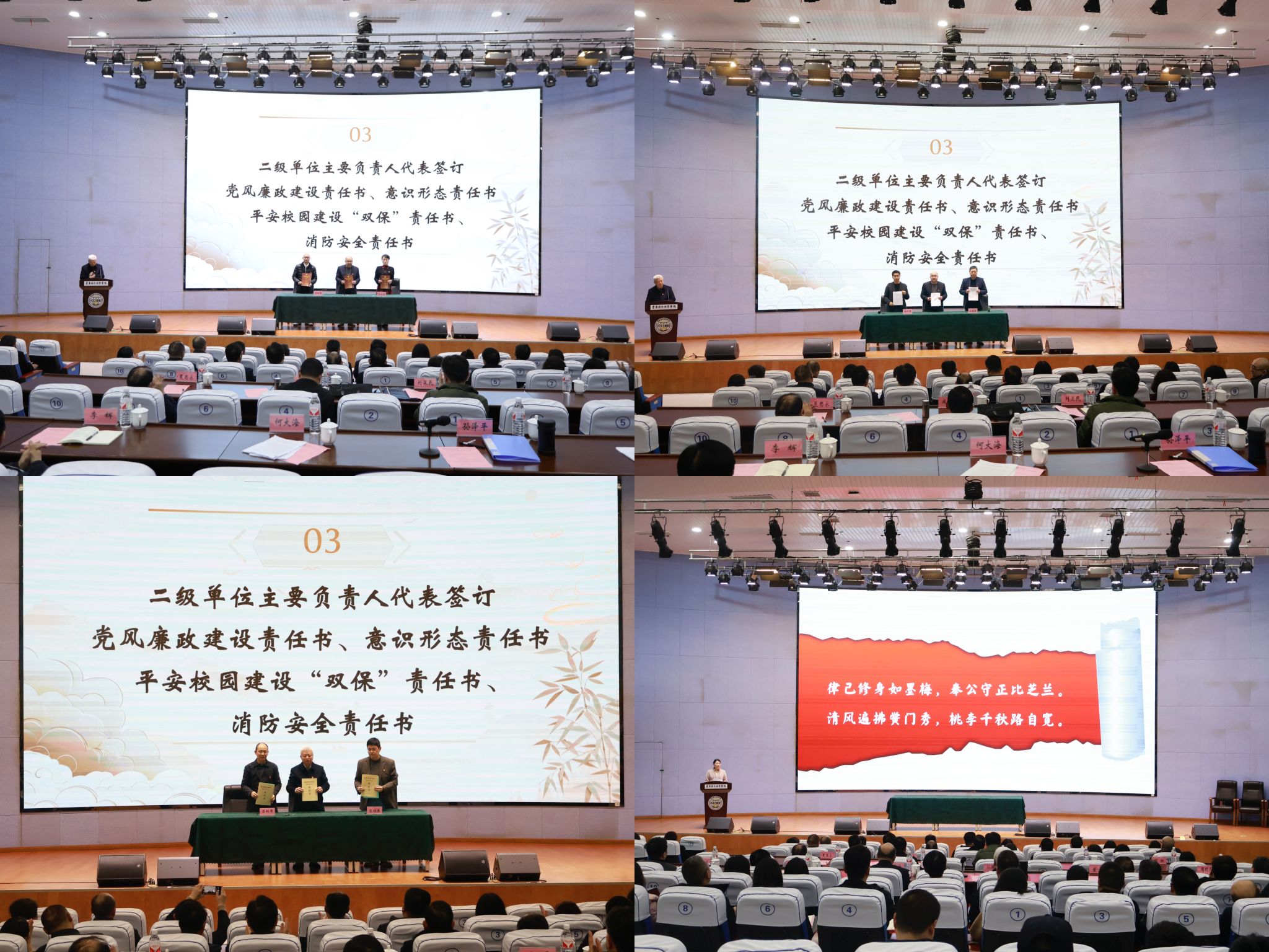 会上,党委书记何大海分别与二级单位主要负责人代表签订了《2025年党风廉政建设责任书》《2025年意识形态责任书》,校长孙泽平分别与二级单位主要负责人代表签订了《平安校园建设“双保”责任书》《消防安全责任书》,纪委副书记张远鹏回顾并总结了2024年学校全面从严治党工作,对2025年主要工作提出了四个方面的工作安排,参会人员集体观看了警示教育片。
