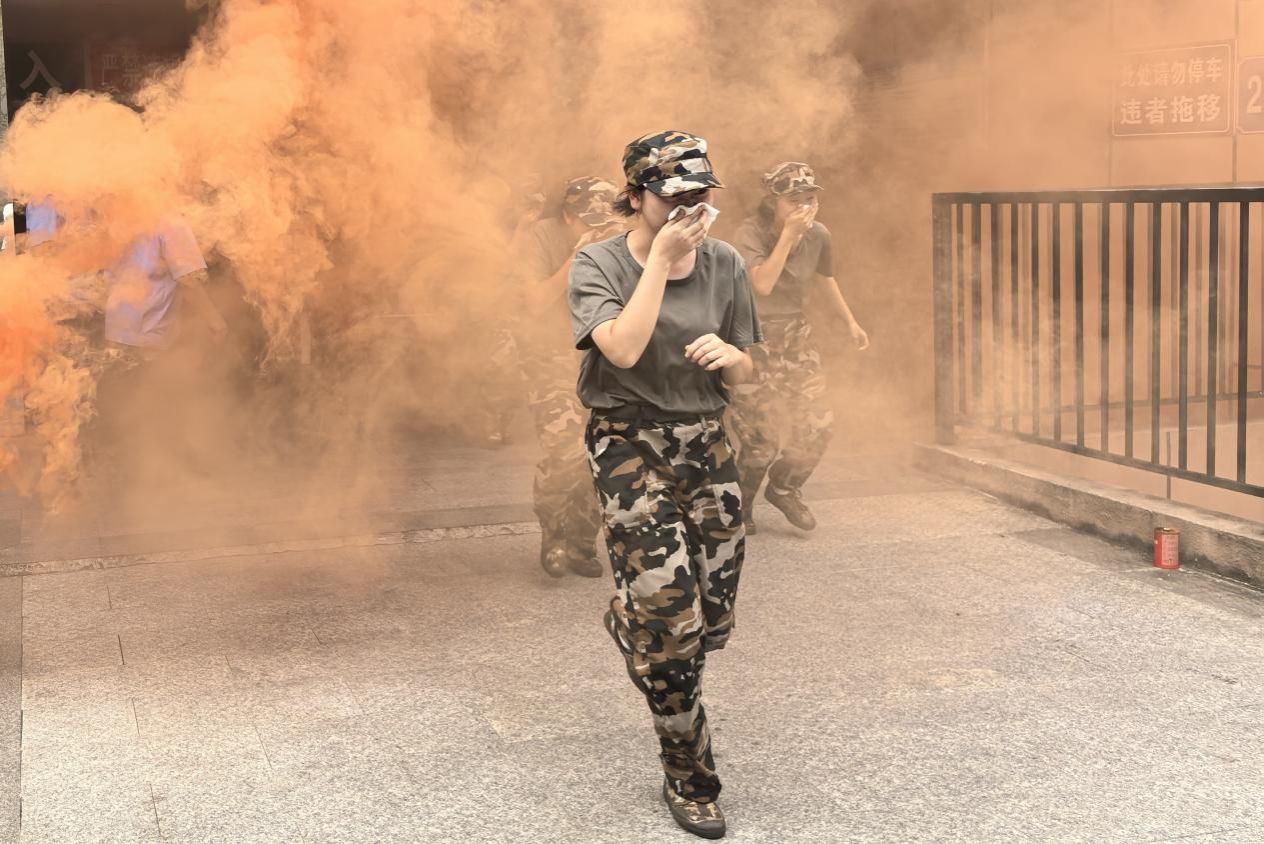 在疏散过程中,同学们反应迅速,用湿毛巾捂住口鼻,沿着指定疏散路线快速、有序撤离。面对模拟的浓烟区域,他们动作规范,规避有效。义务消防队员在抵达现场后3分钟内,迅速完成消火栓连接并成功开启喷水系统,展现了熟练的应急处置能力。