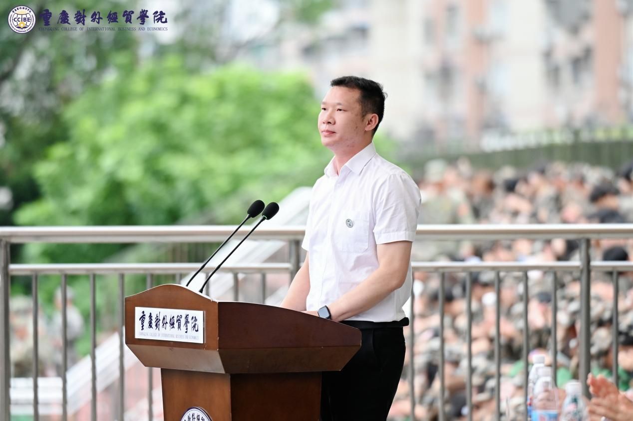 最后,党委书记、督导专员何大海同志发表讲话。他对 2025 级学生军训成果展示活动的圆满举行表示祝贺,对全体军训学员在军训中的出色表现给予高度评价,对军训教官、指导员及相关工作人员的辛勤付出表示衷心感谢。何书记在讲话中对大家提出了三点期望:一是要把“纪律意识”内化于心、外化于行;二是要把“协作精神”融入集体、化为常态;三是要把“拼搏韧劲”刻入骨髓、永不言弃。他希望全体新生能将此转化为未来求学路上的不竭动力,把坚韧品格融入学习实践,既要志存高远,也要脚踏实地,努力成长为堪当民族复兴大任的时代新人,让青春在奋斗中绽放绚丽光彩。