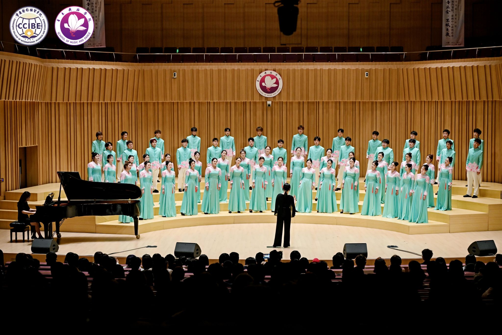 中外艺术融合环节中,韩国歌手李明铉、朴秀珍合作的普契尼歌剧《波西米亚人》选段《冰凉的小手》《人们叫我咪咪》以及浪漫二重唱《多么美丽的姑娘》实现了文化共鸣;尾声的合唱《细雨飘》(重庆酉阳民歌改编)与校歌《经世经贸》,将地方文化与校园精神相融,引发全场情感共鸣。