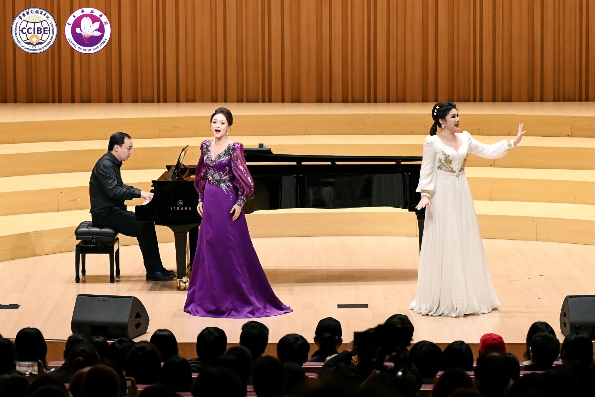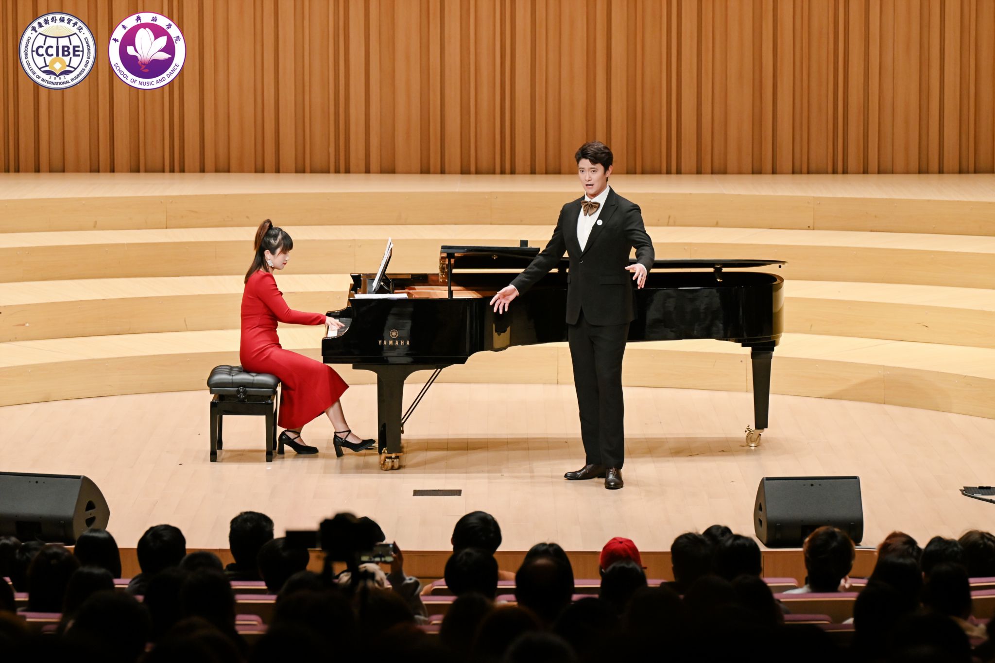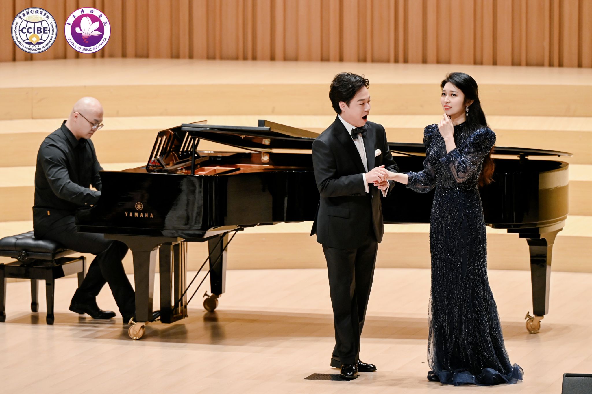 11月10日晚7:00,第三季中韩音乐会·不眠之夜暨“相约贸院”歌剧中心系列活动在学校B校区玉兰艺术中心华彩音乐厅温情上演。本次活动由音乐舞蹈学院主办、校园文化委员会承办,重庆市合川区文学艺术界联合会、合川区音乐家协会指导。学校副校长、校园文化委员会主任、音乐舞蹈学院院长王婕教授,合川区音乐家协会主席杨晓超及副主席唐芙蓉、孔祥爱出席活动,学校相关职能部门负责人与音乐舞蹈学院师生代表共同观看演出,活动由学院教师孙连鹏、张一凡主持。
