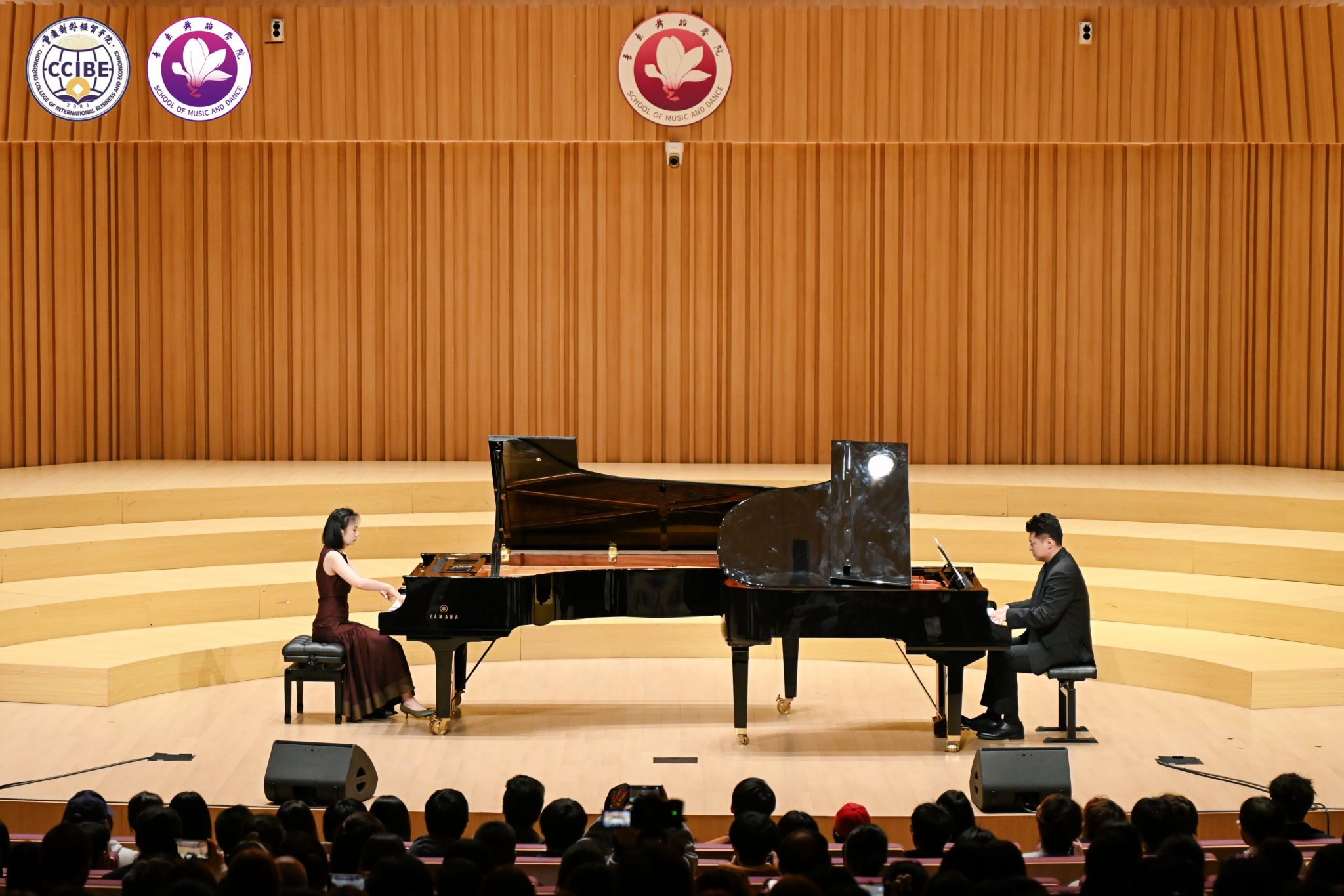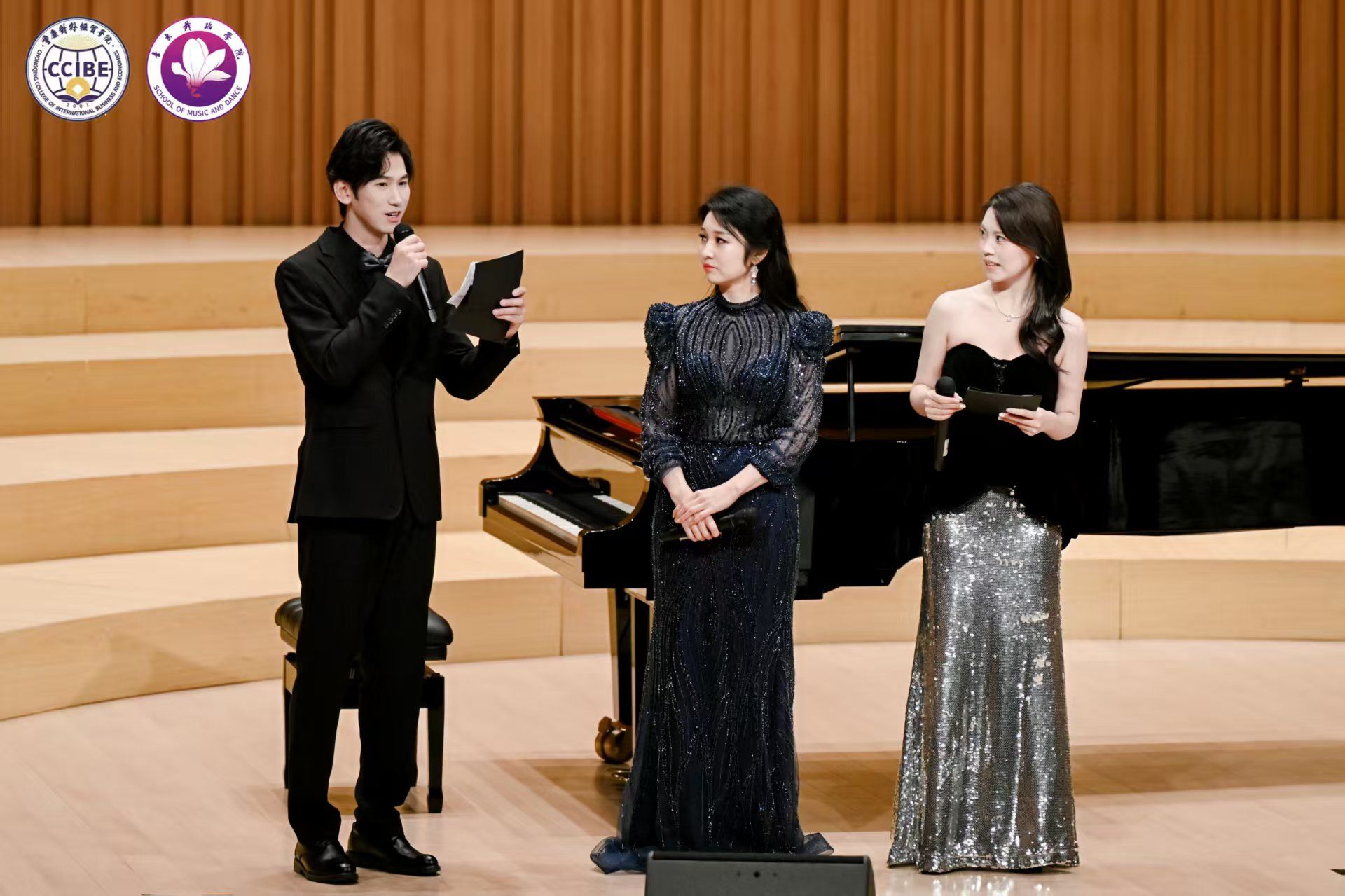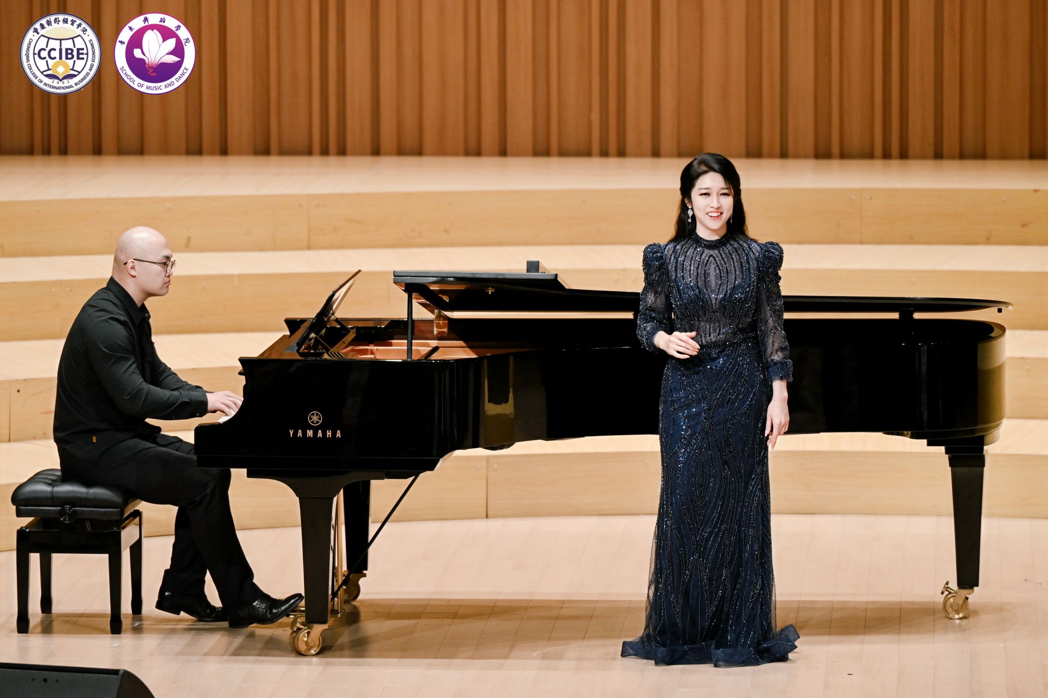 11月10日晚7:00,第三季中韩音乐会·不眠之夜暨“相约贸院”歌剧中心系列活动在学校B校区玉兰艺术中心华彩音乐厅温情上演。本次活动由音乐舞蹈学院主办、校园文化委员会承办,重庆市合川区文学艺术界联合会、合川区音乐家协会指导。学校副校长、校园文化委员会主任、音乐舞蹈学院院长王婕教授,合川区音乐家协会主席杨晓超及副主席唐芙蓉、孔祥爱出席活动,学校相关职能部门负责人与音乐舞蹈学院师生代表共同观看演出,活动由学院教师孙连鹏、张一凡主持。
