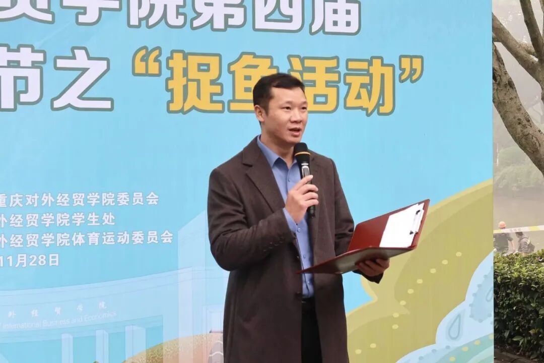 活动伊始,主持人详细解读捉鱼规则及注意事项,着重强调“安全第一,捉鱼第二”的活动原则,叮嘱同学们在参与过程中兼顾自身安全与校园环境维护。校长孙泽平宣布活动正式启动,副校长、体育运动委员会主任李川为活动致辞。他以“上班摸鱼是懒惰,今日捉鱼是勤劳”为喻,指出本次捉鱼活动既是感受生态和谐的自然实践课,也是锤炼团队协作的能力提升课,更是磨砺意志品质的成长修行课。