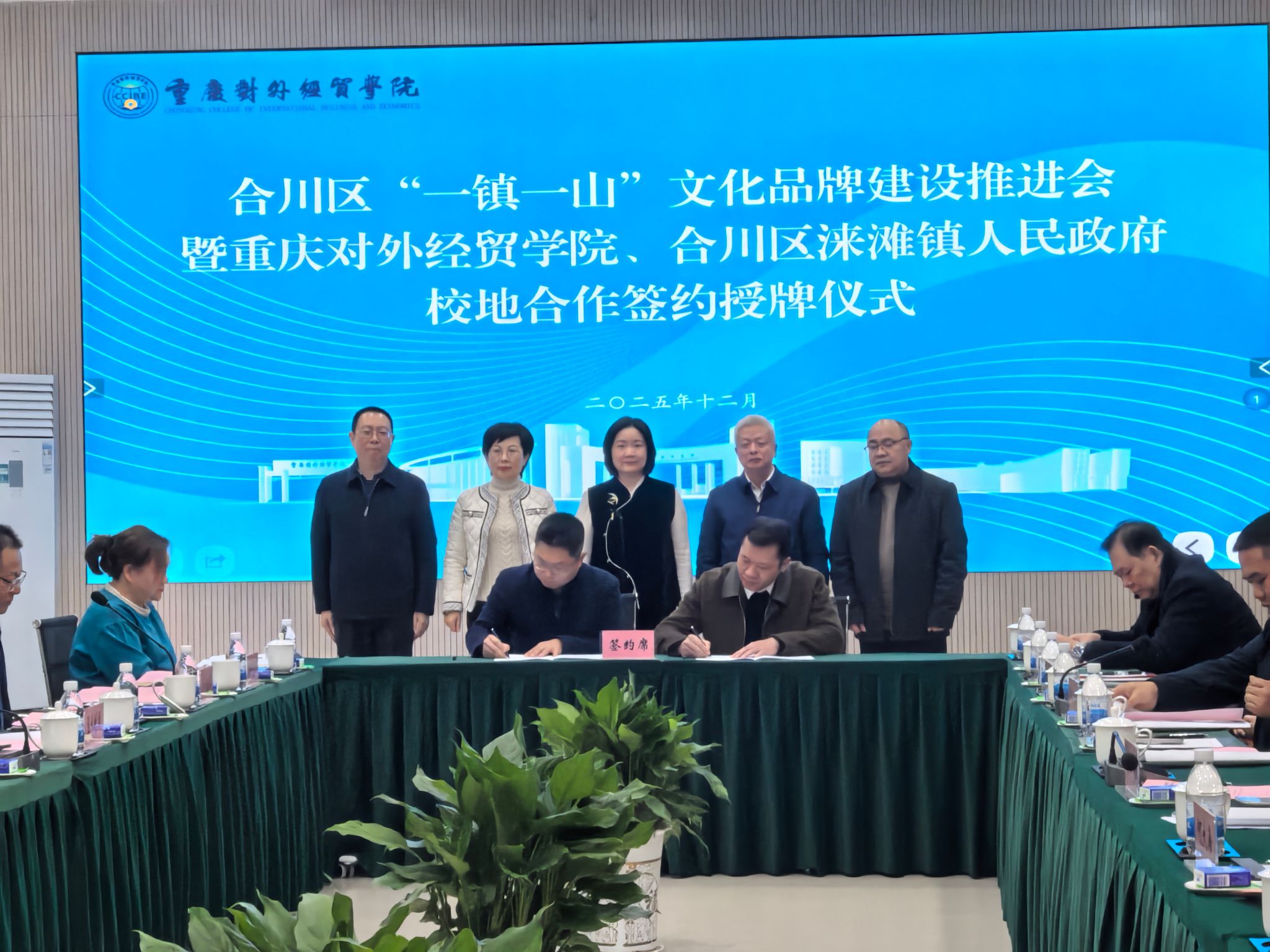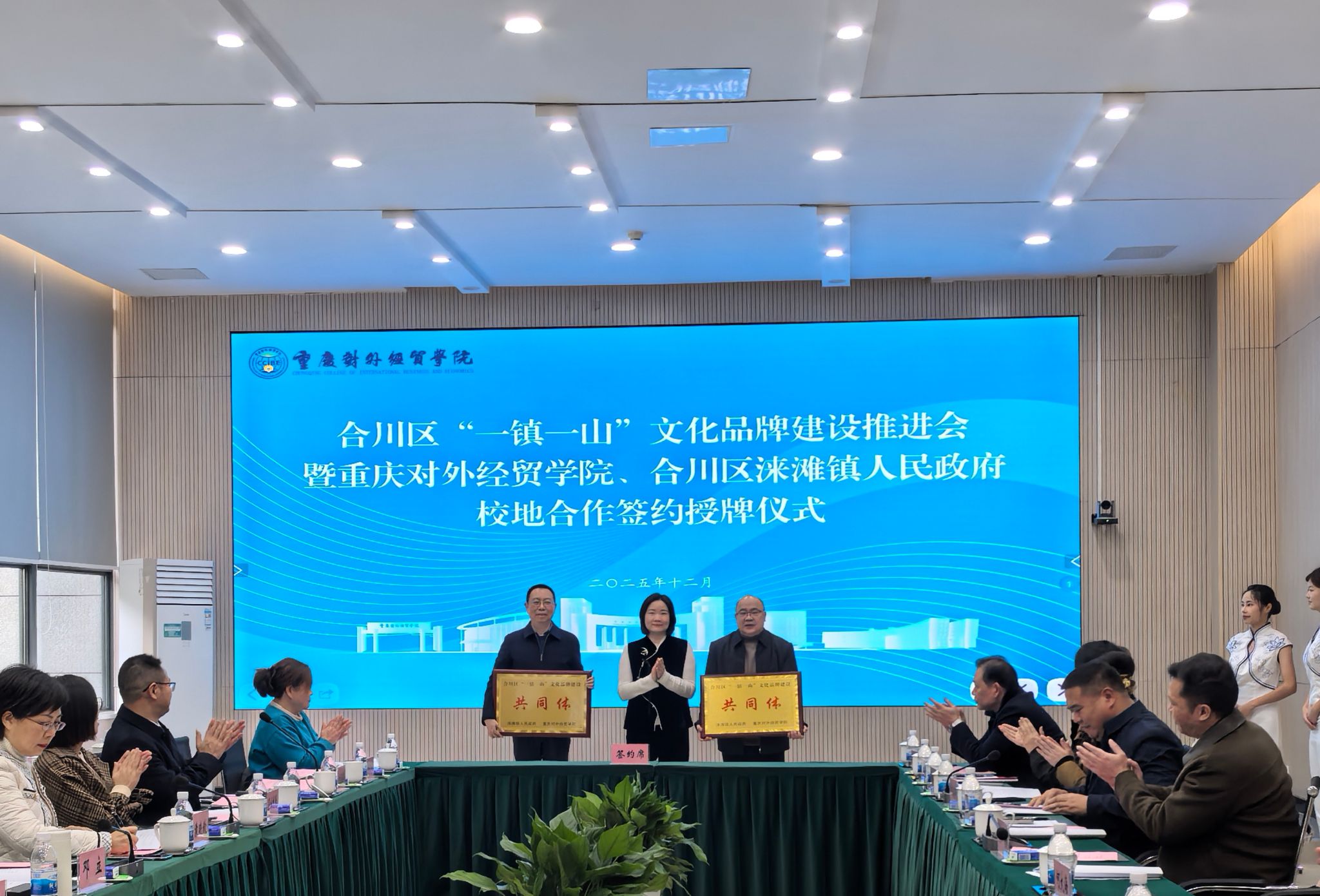 12月18日,合川区“一镇一山”文化品牌建设推进会暨重庆对外经贸学院与合川区涞滩镇人民政府校地合作签约授牌仪式在学校9106会议室成功举行。合川区委常委、统战部部长邓立,区政府副区长袁晓钦参加并发表讲话,校长孙泽平,党委书记、督导专员何大海,副校长李川出席仪式。