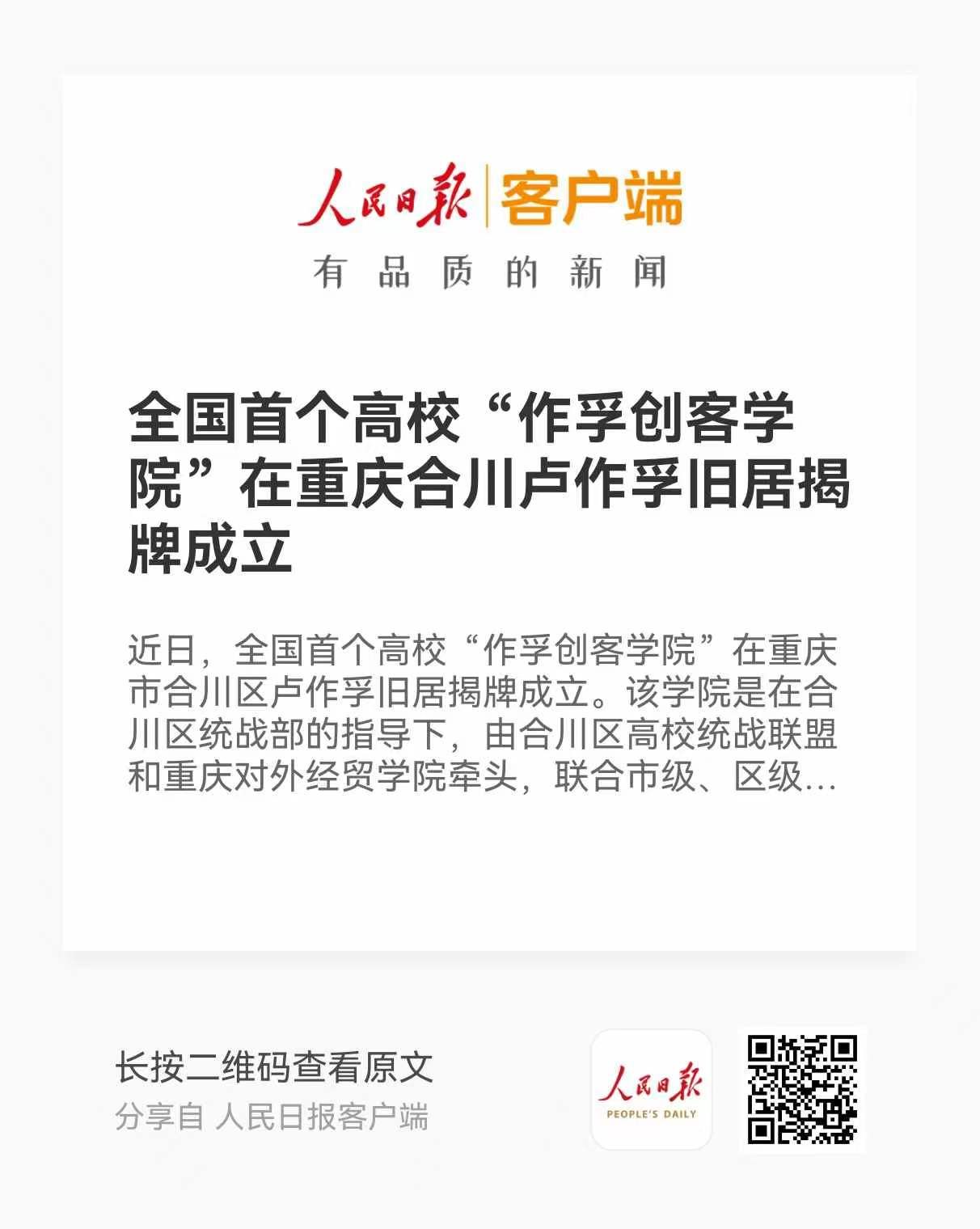 人民日报:《全国首个高校“作孚创客学院”在重庆合川卢作孚旧居揭牌成立》