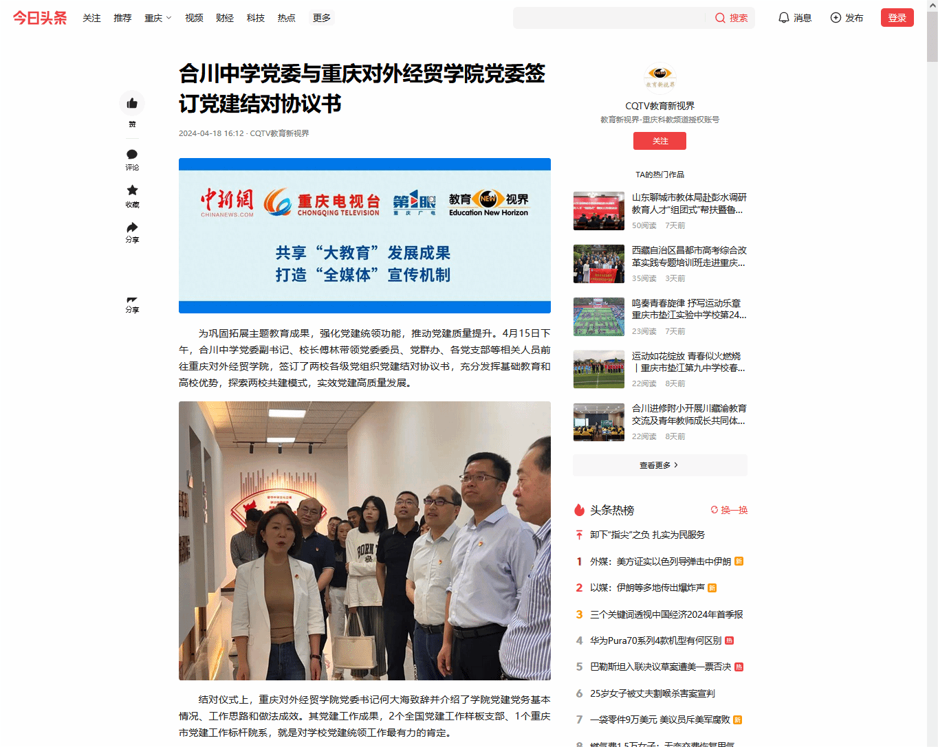 【今日头条】报道合川中学党委与重庆对外经贸学院党委签订党建结对协议书