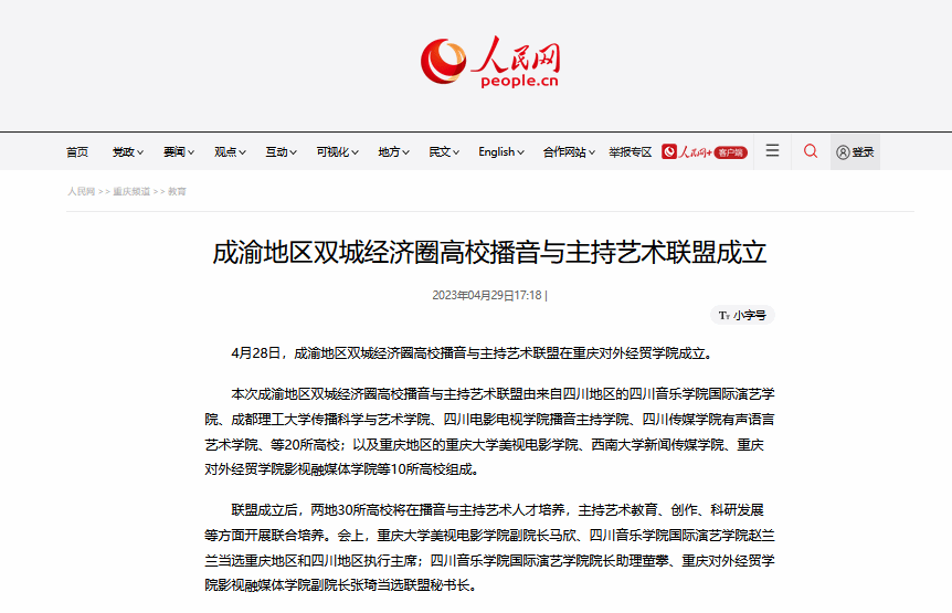 人民网:《成渝地区双城经济圈高校播音与主持艺术联盟成立》