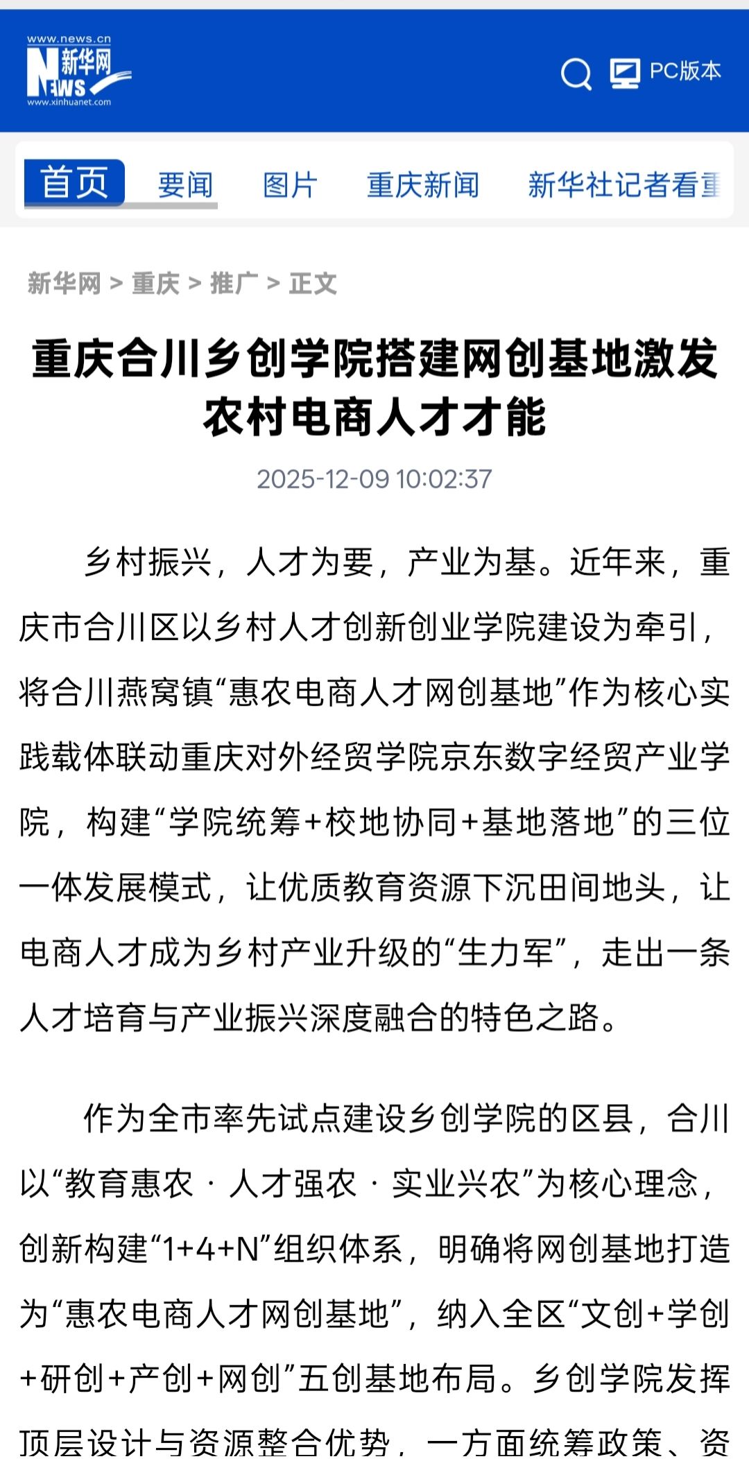 新华网等媒体报道重庆合川乡创学院搭建网创基地激发农村电商人才才能
