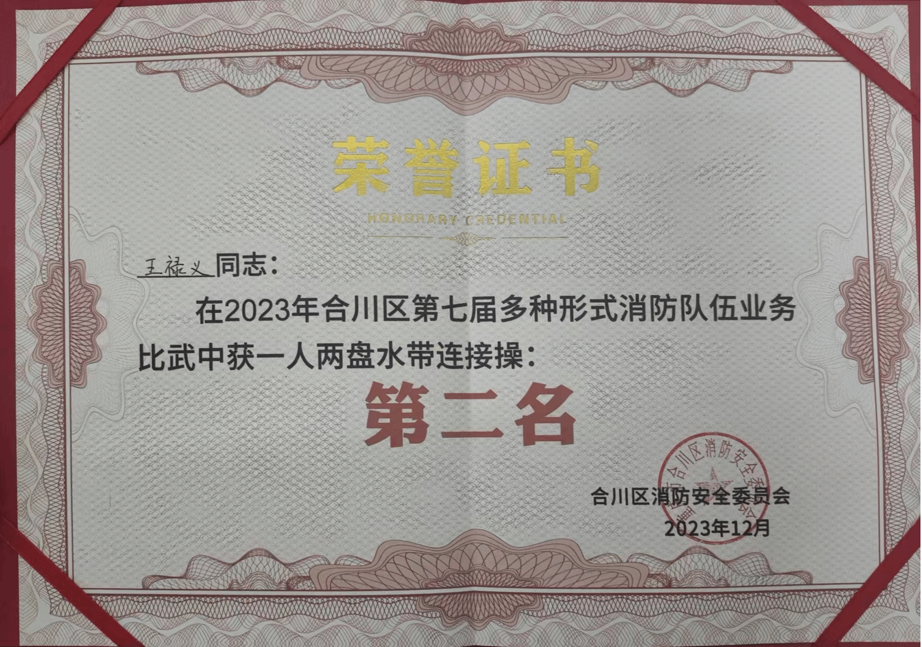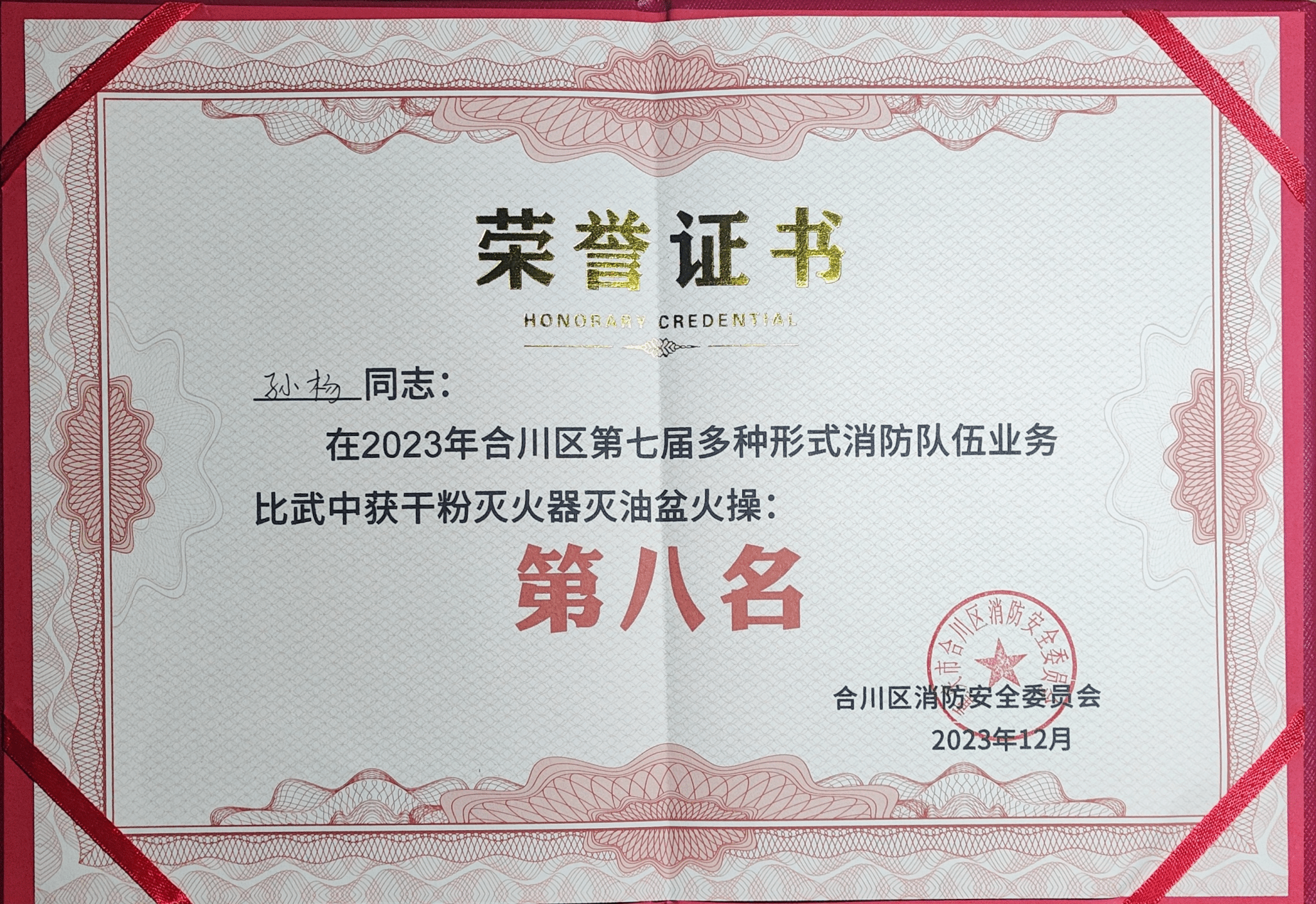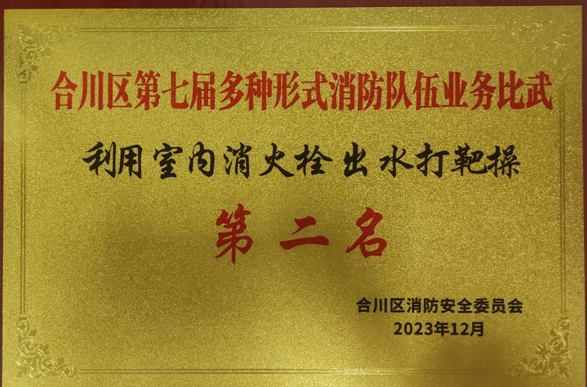 2023年12月28日上午,合川区第七届多种形式消防救援队伍业务比武竞赛在区消防救援支队花滩特勤站举行,学校派出5名代表参加本次竞赛,在三个单项中荣获佳绩。以总分最高成绩荣获微型消防站组团体第一名、参赛代表陈敬松和陈毅荣获利用室内消火栓出水打靶操组第二名,王禄义荣获一人两盘水带连接操第二名,孙杨荣获干粉灭火器灭油盆火操第八名。