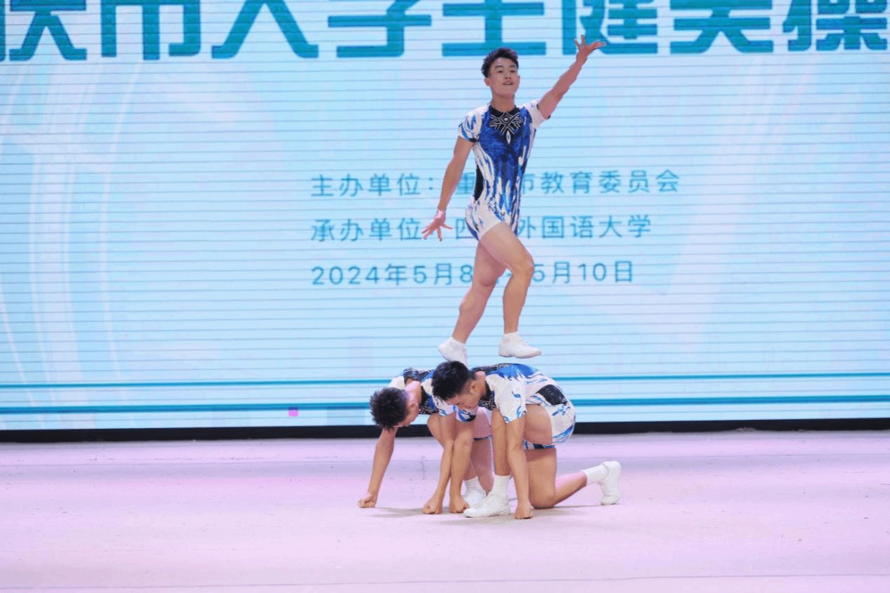 由重庆市教育委员会主办,四川外国语大学承办的2024年重庆大学生健美操比赛于5月8-10日在四川外国语大学大礼堂举行。学校派出了由校体委办公室主任、体育与健康学院副院长贾勇为领队,体育与健康学院教师谭娟、向路、邓茗丹为教练,20名学生组成的重庆对外经贸学院代表队参赛。本次比赛分为甲、乙、丙三个组别,丙组为体育专业(高水平运动队学生、体育特长生、运动系学生等)。