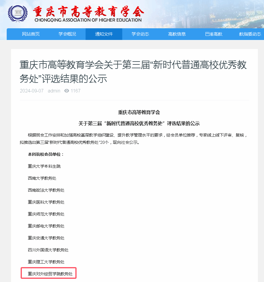 【本网讯】9月6日,重庆市高等教育学会发布《重庆市高等教育学会关于第三届“新时代普通高校优秀教务处”评选结果的公示》,学校教务处被评为重庆市第三届“新时代普通高校优秀教务处”。
