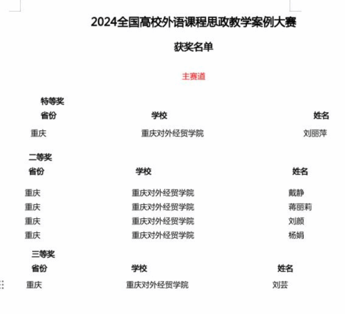 2024年全国高校外语课程思政教学案例大赛由外语教学与研究出版社主办,旨在全面推进高校外语课程思政高质量建设,促进高校外语教师以习近平新时代中国特色社会主义思想铸魂育人,落实立德树人根本任务,通过搭建沟通交流课程思政育人实践的赛事平台,全面提升课程思政建设深入性、创新性与有效性,助力高校服务国家战略、培养堪当民族复兴重任的时代新人。自2024年5月大赛启动以来,外语外贸学院高度重视,结合“三进”教学工作,积极动员、组织教师参赛,以赛促教,以赛促改,持续推进课程思政育人实践。希望学院师生以此为榜样,继续努力,再创佳绩!