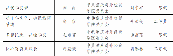 【本网讯】日前,重庆市教育委员会、中共重庆市委统一战线工作部、重庆市民族宗教事务委员会公布了重庆市铸牢中华民族共同体意识教育学生作品征集活动获奖名单,学校4件作品获宣传海报类二等奖。