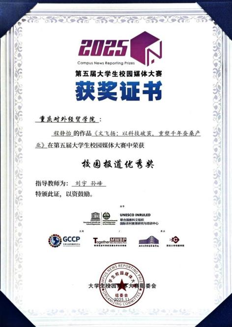 11月1日下午,第五届大学生校园媒体大赛颁奖典礼在深圳大学举行。其中,文学与创意传播学院2023 级新闻学专业学生程静怡凭借作品《文飞扬:以科技破茧,重塑千年蚕桑产业》,从全国 91 所高校报送的 795 份参赛作品中脱颖而出,荣获 “校园报道优秀奖”(该赛道不设等级奖)。我校也成为本次大赛中重庆市唯一入围并获奖的高校,这一成绩充分展现了我院在实践教学与产学研协同育人方面的扎实成效。