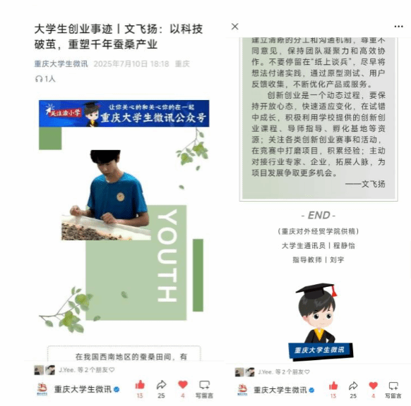 此次获奖作品的诞生,与学院持续推进的实践育人体系紧密相关。学院依托与重庆现代数字经济研究院的产学研合作,将其官方订阅号作为新闻学专业实践平台,程静怡在该平台独立承担创新创业人物专访任务,于2025年6月完成作品创作并发布于“重庆现代数字经济研究院订阅号”。同年7月,该文作为重庆市大学生创新创业优秀案例,被重庆市教委官方平台“重庆大学生微讯”采纳转载,进一步扩大了社会影响力。