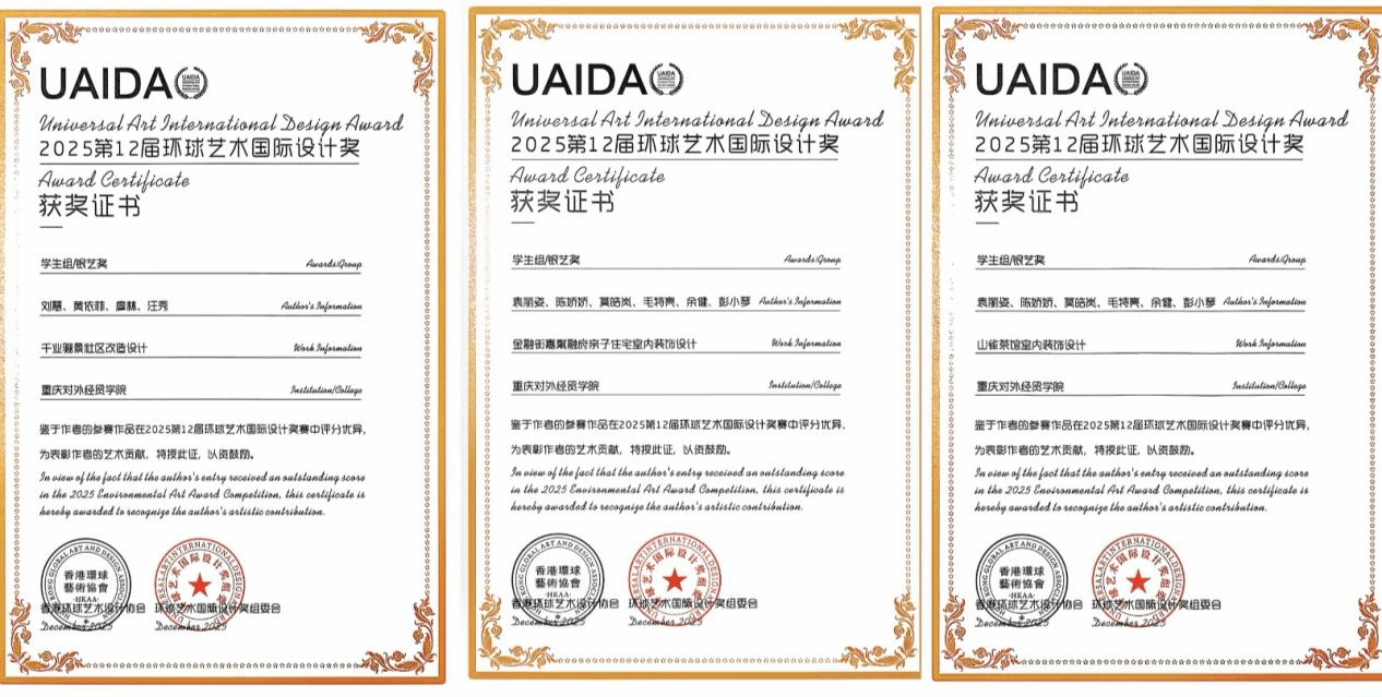 近日,2025第12届环球艺术国际设计奖评选结果揭晓,重庆对外经贸学院艺术设计学院环境设计专业师生表现亮眼,斩获多项荣誉。
