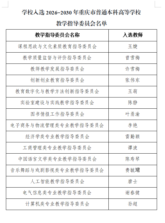近日,重庆市教育委员会公布2026—2030年重庆市普通本科高等学校教学指导委员会换届调整结果,经推荐、遴选、公示、确认等程序,我校15位教师凭借扎实的专业功底、丰富的教学经验及突出的教研成效成功入选委员,充分彰显了学校在学科建设、师资培育与教育教学改革领域的综合实力。