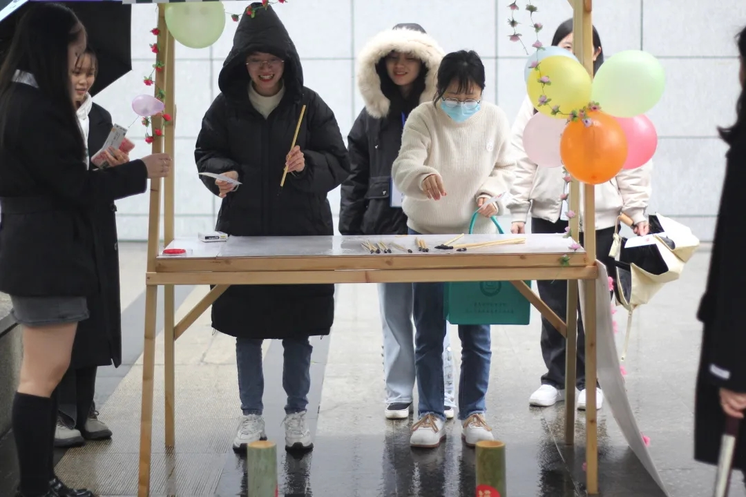 本次活动有“巧御汉字文化”“共味传统文化”与“自由体验文化”三个专区,每个专区设有多个特色项目与趣味小游戏供同学们参与体验。“巧御汉字文化”专区设有:“巧识生僻字”“笔下生花”“吟诗作对”和“趣味猜谜”等特色项目;“共味传统文化”专区设有:“九转陀螺”“三尺投壶”“金钩行环”和“抛足戏具”等传统趣味游戏。在同学们享受各种趣味小游戏的过程中,活动现场利用古风元素营造氛围,通过古典舞、古风戏腔歌曲等文艺节目表演活跃现场气氛,同学们的阵阵掌声便是对此次活动的最大肯定与支持。第三专区“自由体验文化”中的“汉服摄影”“意绘剪纸”“自写书签”“心愿祈福”和“神秘抽奖”等自由体验活动也赢得了同学们的青睐。在“神秘抽奖”处,同学们集章兑换了精美的小奖品。至此,所有小游戏与体验项目已经缓缓落幕。