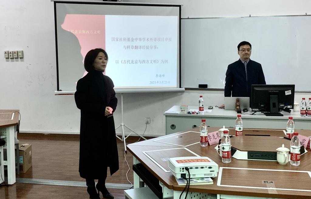 为进一步推动学校外译项目的开展,持续推进科学研究学习走深走实,不断促进学校学科交叉融合,落实学校科研工作高质量内涵式发展,外语外贸学院于2023年3月23日15:00在8303教室开展了国家社科基金中华学术外译项目申报交流会。四川外国语大学李海峰副教授主讲、学院院长李霓、副院长吴耀熙、翻译专业教授李龙泉及学院部分教师代表参加。