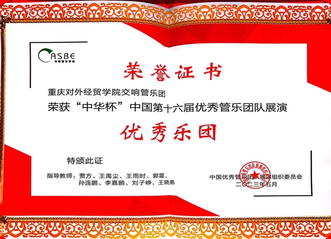 重庆对外经贸学院交响管乐团始建于2014年10月,是学院重要的艺术实践平台,现任团员70余人,由学院管乐教师及学生构成是一支充满活力的团队。近年来,乐团成员先后参与各类比赛及演出共计30余场。包括举办历年学院新年音乐会,参与合川区新年音乐会,参加重庆第四届、第五届大学生艺术展演活动并取得二等奖的好成绩。2021年,乐团受邀参加中央广播电视总台(央视频)全国校园管乐团队展演并获“最佳演奏奖”、2022年参加“喜迎二十大"全国优秀管乐团央视频展演活动获得"优秀视频展播奖"、同年参加第十五届“中华杯”全国优秀管乐团展演获得“优秀乐团”称号。