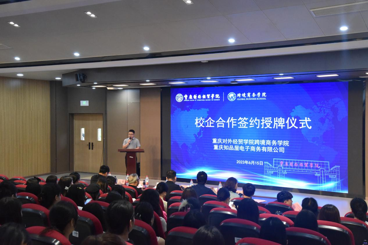 为响应国家号召,贯彻落实我校“内涵发展、产教融合、服务地方、形成特色”的办学理念,为学生成长成才、实践就业搭建平台,重庆对外经贸学院跨境商务学院与重庆知品屋电子商务有限公司签约授牌仪式于2023年6月15日15点在我校合川B校区1115报告厅隆重举行。重庆对外经贸学院副校长蒋满元、跨境商务学院院长赵逖、跨境商务学院党总支书记任伟,重庆知品屋电子商务有限公司董事长宋韵韵、CEO刘勇登,成都内力科技有限公司(小红书官方服务商)内容总监黄巧等领导嘉宾莅临本次活动现场。