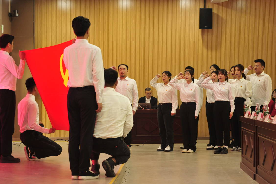 首先,活动开始,全体起立,齐唱《国际歌》,随后党总支组织员刘坤奇同志宣读新发展党员批复,并由学院院长、党总支纪检委员赵逖同志为新发展党员代表佩戴党徽。