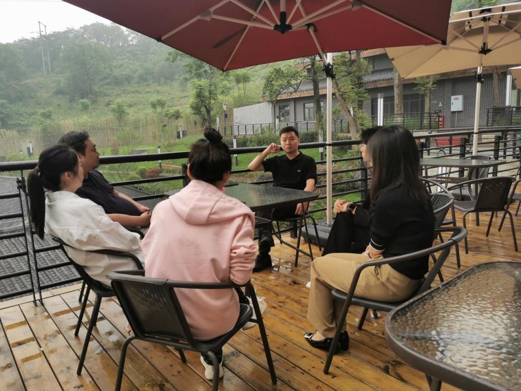 随后,影视融媒体学院一行人与《红岩红》项目负责方蓝海众浪文化科技(成都)有限公司教育投资部副总裁秦立栋以及剧目负责人展开交流。