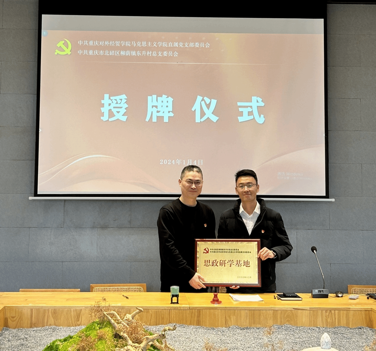 图为:李亚军(左)与江洪流(右)参加思政研学基地授牌仪式(拍摄/王萌)