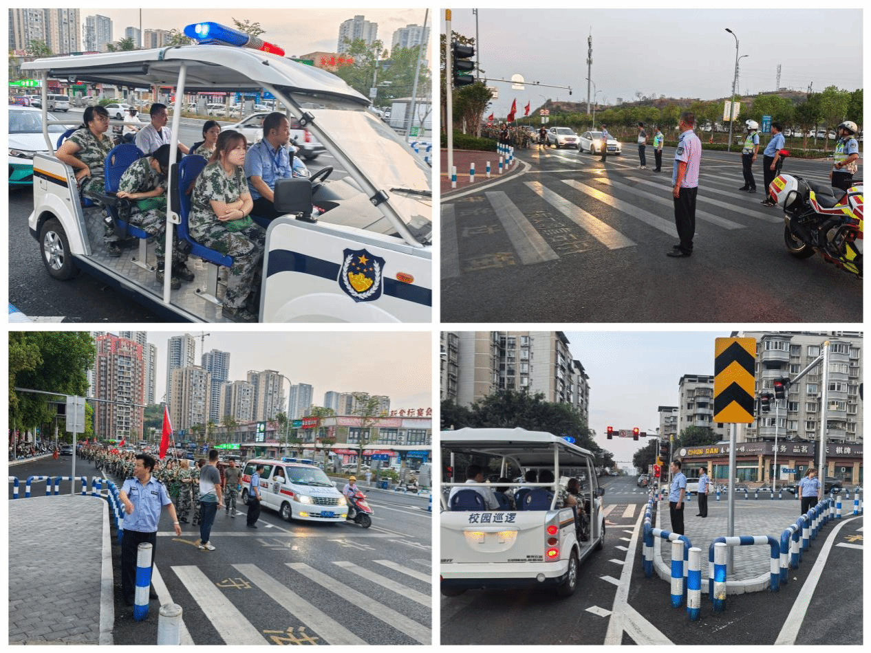 本次拉练活动,学生人数多,队伍长,沿途经过多个路口,部分路段人流、车流量大,除了值班人员,保卫处、校卫队全体成员全部下沉一线,在拉练队伍出发前全部就位。执勤交巡警们骑着巡逻摩托车,有的在拉练队伍最前方开路,有的在拉练队伍旁边随行。遇到人行横道、转弯和转盘等重要路口,交巡警采取临时交通管制、现场疏导指挥。道路引导小组的安保人员协助交警,引导过往车辆和行人避让,护送拉练队伍安全通过十字路口。