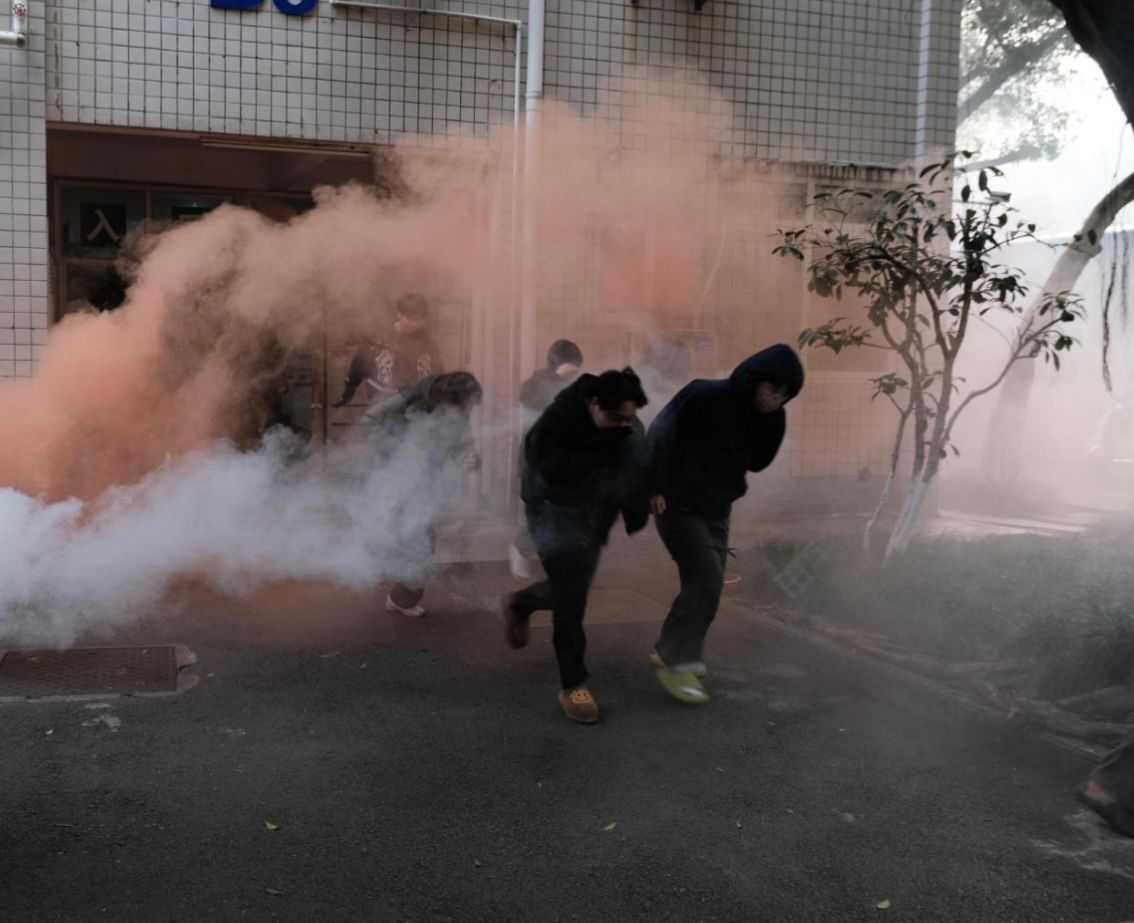 A校区逃生疏散演练现场,学生用湿毛巾捂住口鼻低姿疏散