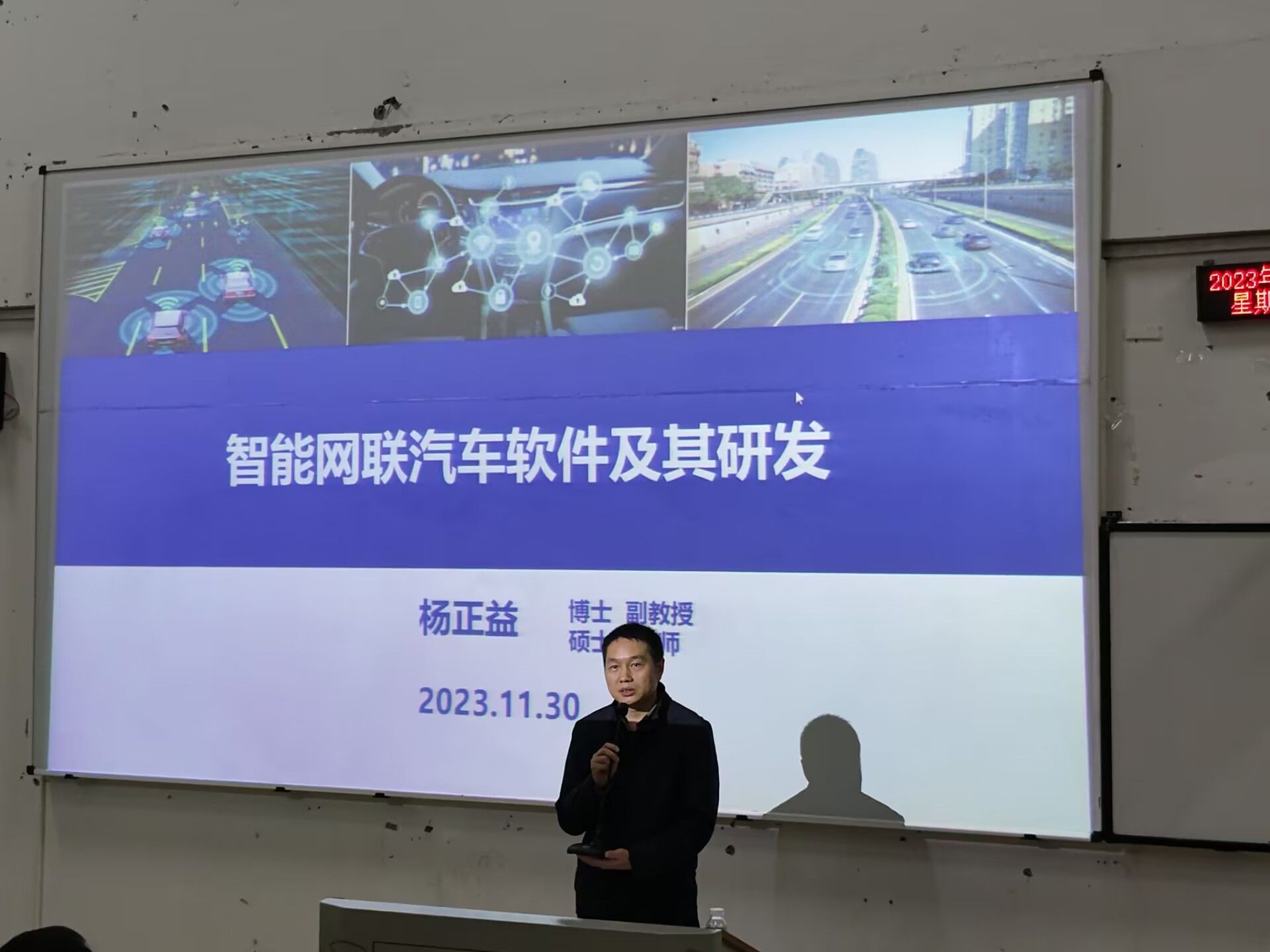 随着AI、大数据、云计算等技术的不断进步,智能软件将变得更加智能化、高效化和自适应,汽车不仅是出行工具,更是智能生态系统的一部分。为更好地了解智能网联汽车软件及其研发的最新动态,提高学院学子对该项技术的认知与了解。数学与计算机学院于2023年11月30日下午,邀请重庆大学大数据与软件学院硕士生导师杨正益到合川A校区A6116教室开展“智能网联汽车软件及其研发”的学术讲座,本次讲座由数学与计算机学院院长陈东升主持。