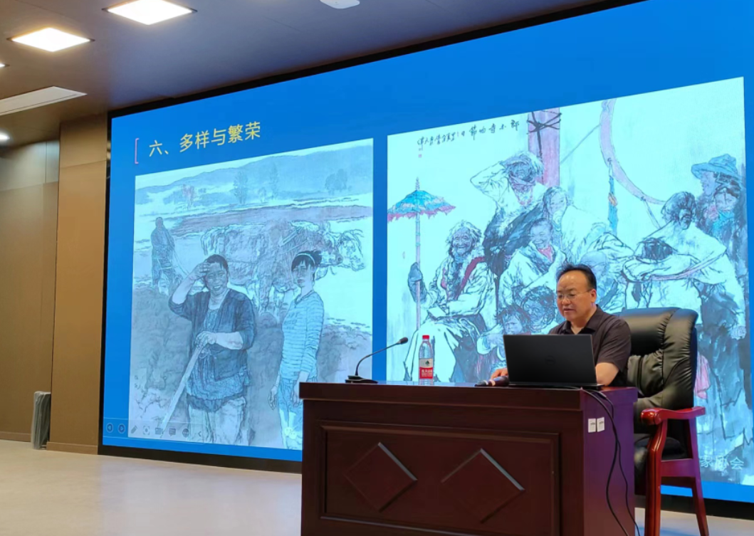 陈建华教授分别从教育体系的重建和审美价值的确定两个方面对新中国话运动对当代中国人物画产生的深刻影响进行了简单的介绍。以时间为引线,从新中国画运动产生的背景和影响;承上启下的“海上三任”;“徐蒋体系”--向中国画的转型迈出重要一步;“徐蒋体系”及其影响-强调“师造化”;写实造型方法的思辨——关于素描;多样与繁荣;陈建华个人作品;中国画发展之路——“内卷化”等八个方面对新中国画运动为同学们进行了介绍。以新中国画运动的背景入手,展现当代中国画发展进程。陈教授用大量的当代作品和丰富的个人作品与经验为结尾,深入浅出,图文并茂的为学生与老师们带来了令人印象深刻讲解。
