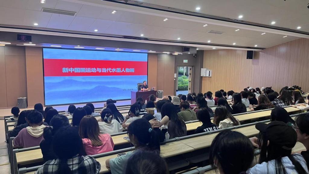 2023年5月28日晚上七点,艺术设计学院在合川B校区开展了由西南大学美术学院陈建华教授主讲的“以美育人、以美培元”系列之《新中国画运动与当代写意画》主题讲座。艺术设计学院艺术教育教研室的教师们与艺术设计学院各个专业的同学共同聆听了本次的讲座。