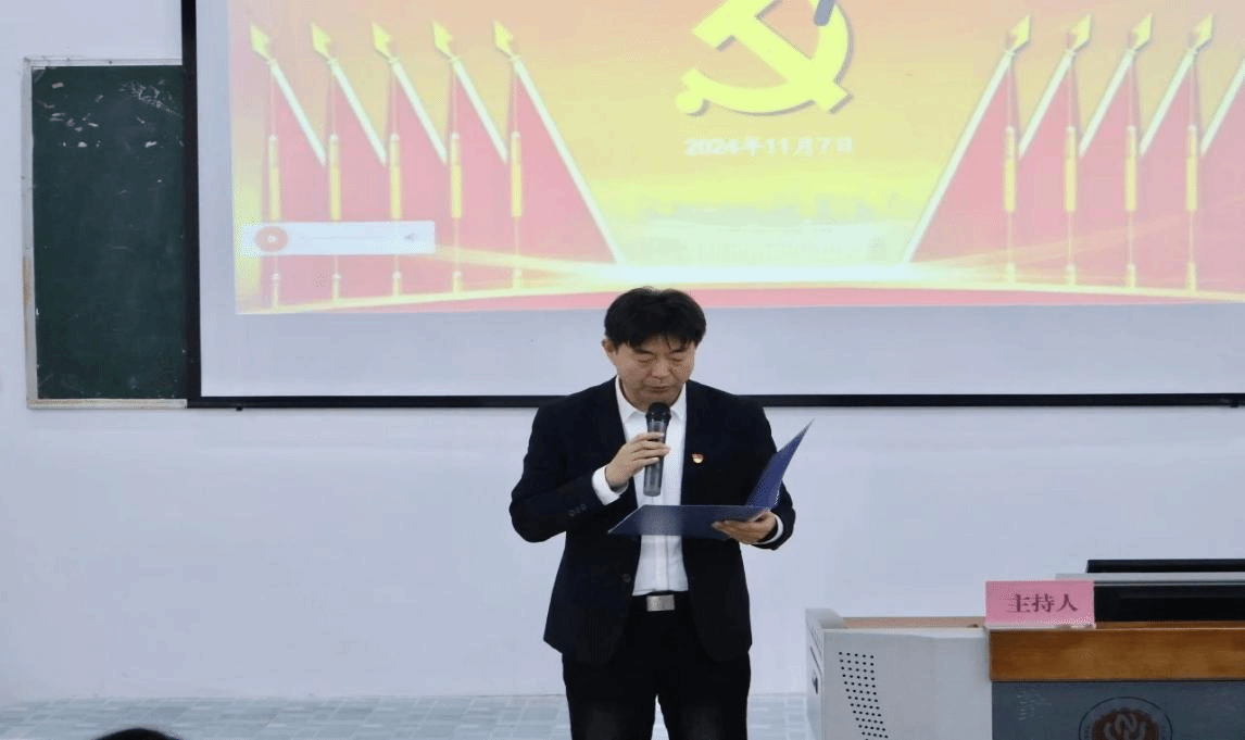 图为刘卫民同志宣读上级党委同意召开换届改选大会的批复