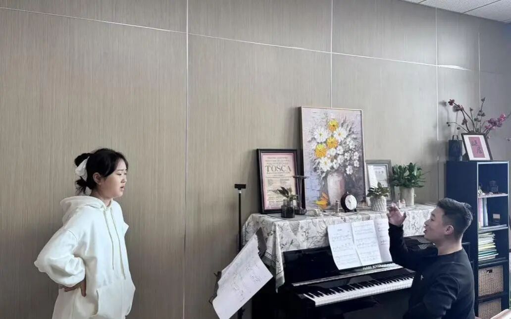 声乐教师的指尖在谱线上播种