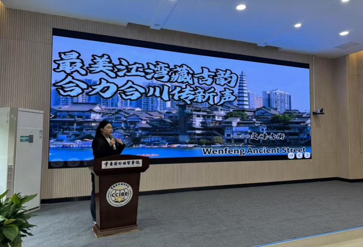 活动伊始,全体人员齐唱中国共产主义青年团团歌《光荣啊,中国共青团》,激昂的旋律拉开了比赛序幕。接着,主持人梁馨元详细解读了本次活动的评分细则,包括选手整体形象气质、互动能力与感染力,内容的真实性与规范性等核心评分维度,让在场选手与观众对评选标准了然于心。随后,参赛选手们按照抽签顺序依次登台展示,他们凭借扎实的中英双语功底,或娓娓道来,或激情澎湃,以流畅的表达能力和饱满的精神状态,围绕“合力合川・最美江湾”主题展开精彩解说。选手们结合江湾历史文化,用双语讲述往昔故事,聚焦江湾生态发展,以专业视角阐释生态之美,充分展现了当代大学生的青春风采与跨文化沟通潜力。在选手完成双语解说后,评委老师们结合专业领域及活动主题进行点评及提问,为选手提升跨文化传播能力提供精准指引。期间,现场观众共同观看了以合川秀丽风光与人文底蕴为主题的视频,进一步深化了大家对活动主题的理解。紧接着,由校团委干事樊林鑫老师公布最终成绩,肯定了所有参赛选手的积极参与和出色表现。活动最后,全体参赛选手、评委及工作人员合影留念。
