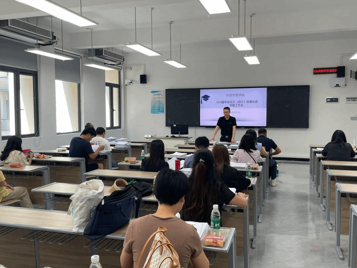 为加强和改进教育督导评估监测,保证本科人才培养基本质量,进一步规范毕业论文(设计)管理,提高本科毕业论文(设计)质量,确保学术研究的创新性和真实性,切实做好2024届本科毕业生的毕业论文(设计)工作,外语外贸学院于5月24日在B6207组织开展了2024届本科毕业论文(设计)质量检查专题工作会,副院长吴耀熙、论文管理员杨丽及高级职称教师共计40余人参会。