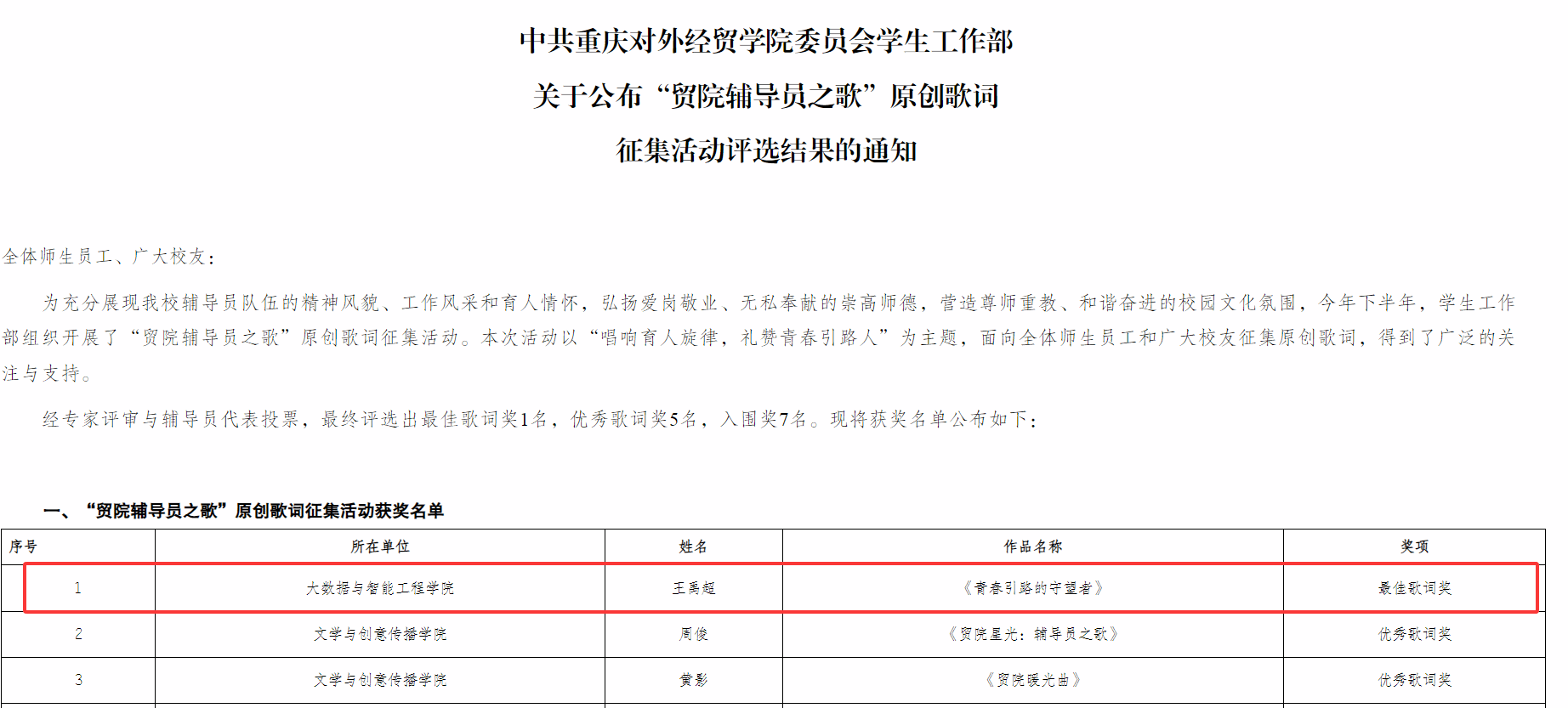 图为“贸院辅导员之歌”原创歌词征集活动评选结果